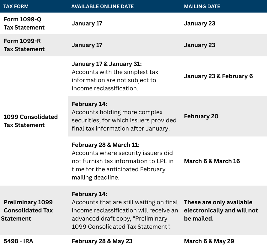 It’s everyone’s favorite time of year again – tax season! There are several dates to be aware of regarding your tax forms from LPL Financial and other asset custodians. Most of the tax forms will be mailed out between January and March to meet all IRS deadlines. You may also find copies of the tax forms online in Account View 2.0 in the Documents drop down menu and by clicking Tax Forms. Please see below for the current mailing dates of the LPL tax forms: